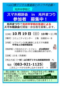 10月19日(日)に光井コミュニティセンターで行われる 光井まつりで光井中学校の生徒によるスマホ相談会を開催!参加者を募集します。 【日時】10月19日(日)10時~11時 【場所】コミュニティセンター 2階 会議室A・ …