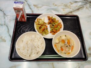 本日の給食は、郷土料理でした。 <メニュー> 麦ごはん 牛乳 チキンチキンごぼう(おなじみ山口県給食が発祥の人気メニュー) くきわかめ和え お嫁さんだんご汁(田布施町の郷土料理) 3年生にとって、小学校時代から慣れ親しん …